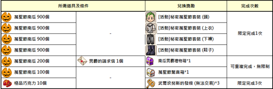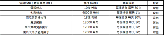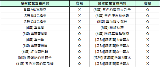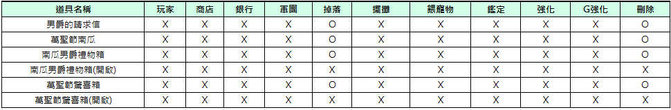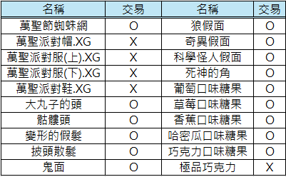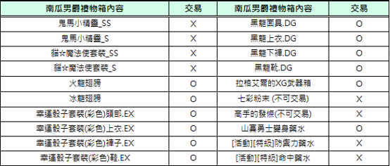 2) 活動相關道具[南瓜男爵的禮物箱], [萬聖節驚喜箱]不可交易及銀行保管,但箱子內部份道具可交易。