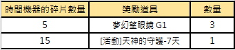 5.此活動以帳號為單位,但拉麥爾、卡蕾兒、阿勒斯伺服器與哈比兔、勇者咕咕伺服器的時間機器的碎片數量將會分開計算,若同一帳號於兩邊伺服器都達成條件,在拉麥爾、卡蕾兒、阿勒斯伺服器會獲得一次獎勵,同時在哈比兔、勇者咕咕伺服器也會獲得獎勵。