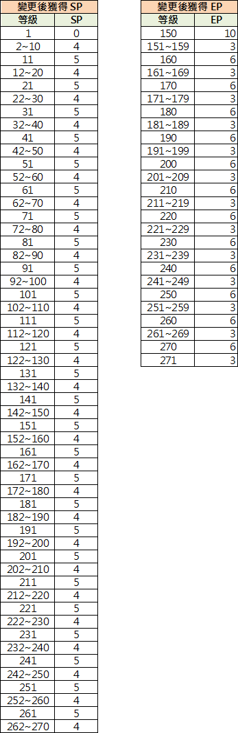 2019/10/24(四)維護後,升級時的技能點數已進行更新,以下為各等級可獲得的SP、EP點數: