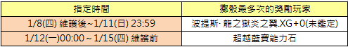 ※ 預計1/21(三)前公布得獎名單,獎勵道具將於1/22維護時配發。