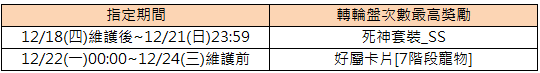 1. 本次活動期間內,於下列指定時間內,【轉輪盤】最多次數的玩家,將可額外獲得獎勵!