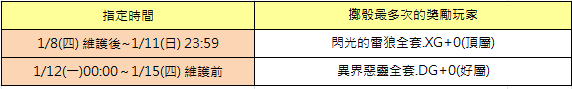 2. 得獎名單將於2026/1/21(三)前公佈,會於2026/1/22(四)維護時進行配發,將會配發至得獎帳號內最高等級角色信箱。